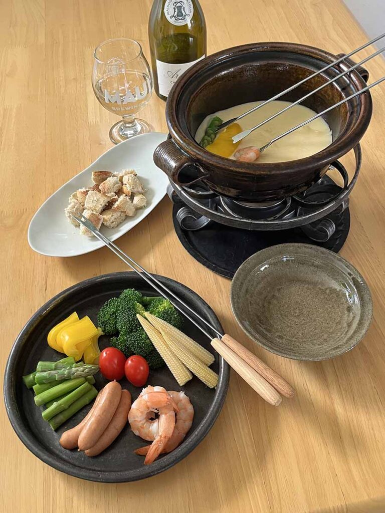フォンデュは、好きな材料を生またはゆでたものを準備するだけでいいので、気軽に始められます。今回はエビ、アスパラ、ブロッコリー、トマト、ウィンナー、パプリカを、23センチの黒唐津の銅鑼鉢に盛り合わせました。文字通り銅鑼の形をしていて縁が立っているのが特徴です。この縁の存在感がただの皿ではない魅力を醸し出してくれます。土屋由紀子さんの作品です。渋い色深い黒が色とりどりの食材を引き立たせてくれます。取り皿は、15センチ、深さ5センチの斑唐津(まだらがらつ)の皿で、汲古窯の峰松義人さんの作品です。そのサイズと、深さや軽さも、取り皿には最高の一品です。フランスパンは必ず皮が入るように一口サイズでカットします。皮はチーズをパンに絡める時に落下防止となってくれますよ~。優しい形の楕円皿26センチは有田焼・李荘窯のものです。お皿の縁の部分の一点に、金の雫のような加飾がされているのですが、長年愛用しておりましたら薄くなっていました(単品の写真の左上に見えます)。 ここまで来たら、やっぱりワインですよね。このグラスは、ハワイマウイ島のマウイブルワリー(ビール会社)のレストランで、旅の思い出にと求めたものです。高価なものではありませんが、使う度にマウイでのことを思い出しています。