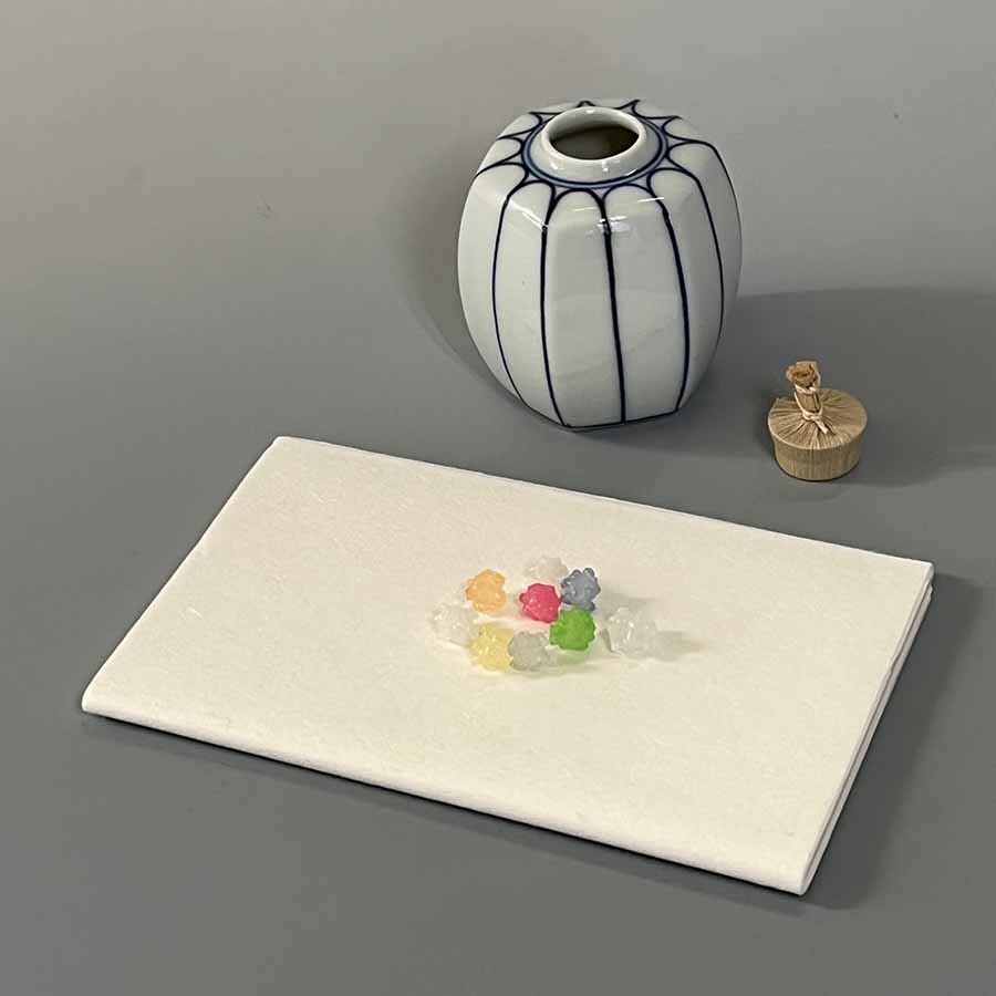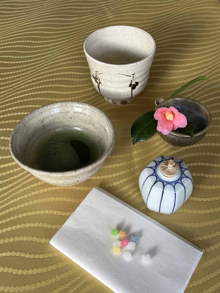 | メニュー | 抹茶(十日恵比寿神社抹茶・福岡県八女市 星野製茶園)、金平糖(京都のお土産) |