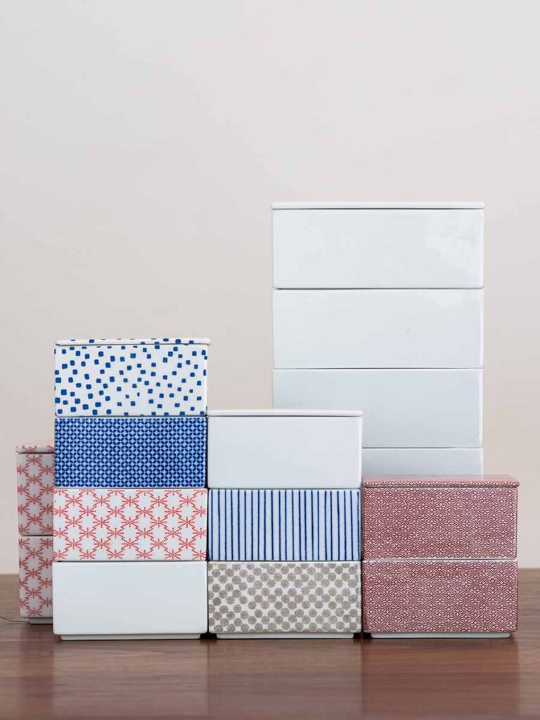 会場は3視点の3エリアで構成。高低差の目線と、品々を手に取れる位置で展示、さらに山田氏による1点1点のモノの製作背景にまでに言及する600字程度の紹介文が会場を飾る。例えば「味わう」のコーナーのTIME & STYLEの定番商品である波佐見焼の「重箱」では、「日本の伝統的な重箱を日常使いできる器として再解釈したシリーズ」として、磁器による重箱製作の難しさと印判の絵付けを説明。さらに保存容器としての機能性、電子レンジや食洗器に対応可能と、木製重箱を磁器としたことで広がる利便性にも触れる。文は各社のネットショップにリンクするQRコード付き。また一角には気に入ったモノ、作り手に応援コメントを投函するコーナーも設ける。