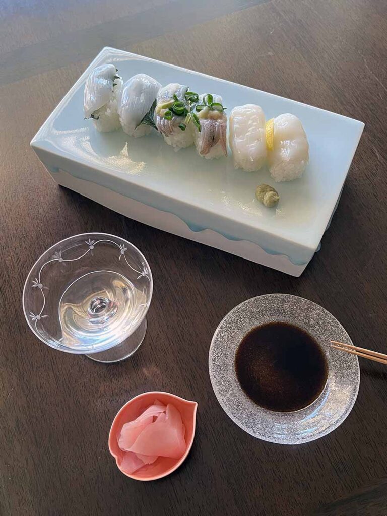 私はどうしてもこのステージのような器に握り寿司を盛りつけたいと考えました。子供の頃、握り寿司といえば来客のおもてなしに出前をとり、そのついでにいただけるという憧れの食べ物だったのですが、近年は気軽に回転寿司やスーパーのお総菜売り場でも購入できるようになりましたね。この器なら、そのお寿司さえも高価に見せてくれるような気がしたのです。ただ、定番の盛り合わせだとこの美しい青磁が引き立たないので、今回は器の美しさを生かせるお寿司を選んでみました。イカの3種盛りです。