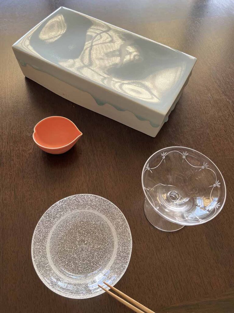 薄ピンクのガリを入れた桜の花びらの形をした小付は、伊万里の瀬兵窯。小品ながら、春を待ちわびる私の気持ちも表現したつもりです。しょうゆ皿は泡硝子で、旅先の岡山で記念に求めたもの。お箸も春らしく軽やかに竹の細箸です。せっかくだから日本酒も一杯。合わせるお酒は佐賀の東一(あずまいち)。美味しいからと、飲みすぎないように。