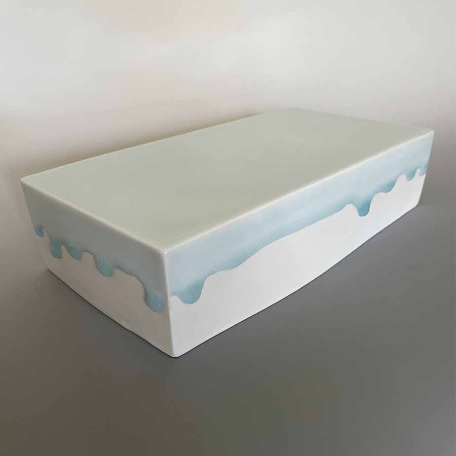 さて、今月は数年気になっていた作家さんの器をついに手に入れました。初使いです。写真の握り寿司を載せたものがその器です。これは、白磁の長角の箱を伏せて、上から濃度の高い青磁の釉薬をかけ、その流れるさまをそのまま留めるように焼き上げたという感じです。端正な形の白磁の「静」と、今にも垂れていきそうな青磁の溜まりの「動」が対照的な景色となり、存在感を増しています。佐賀県有田町で作家活動をされている西隆行さんの作品で、この釉薬の垂れたものを「雫」シリーズというそうです。