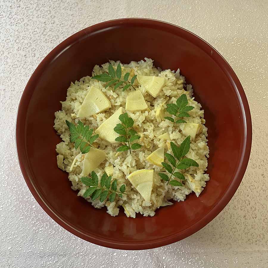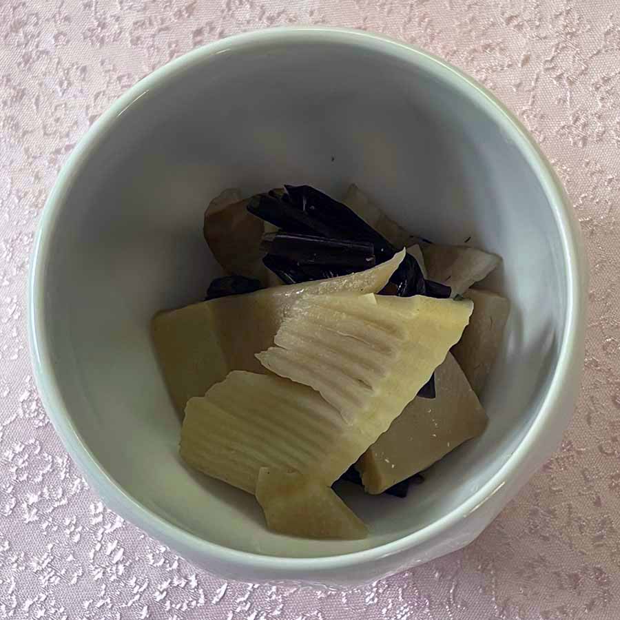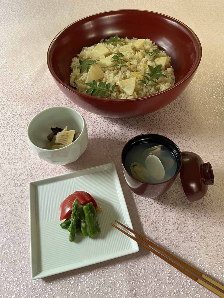 | メニュー | たけのこご飯、アサリの澄まし汁、小串トマトとアスパラのサラダ、ワラビとタケノコとブラバラの煮物 |