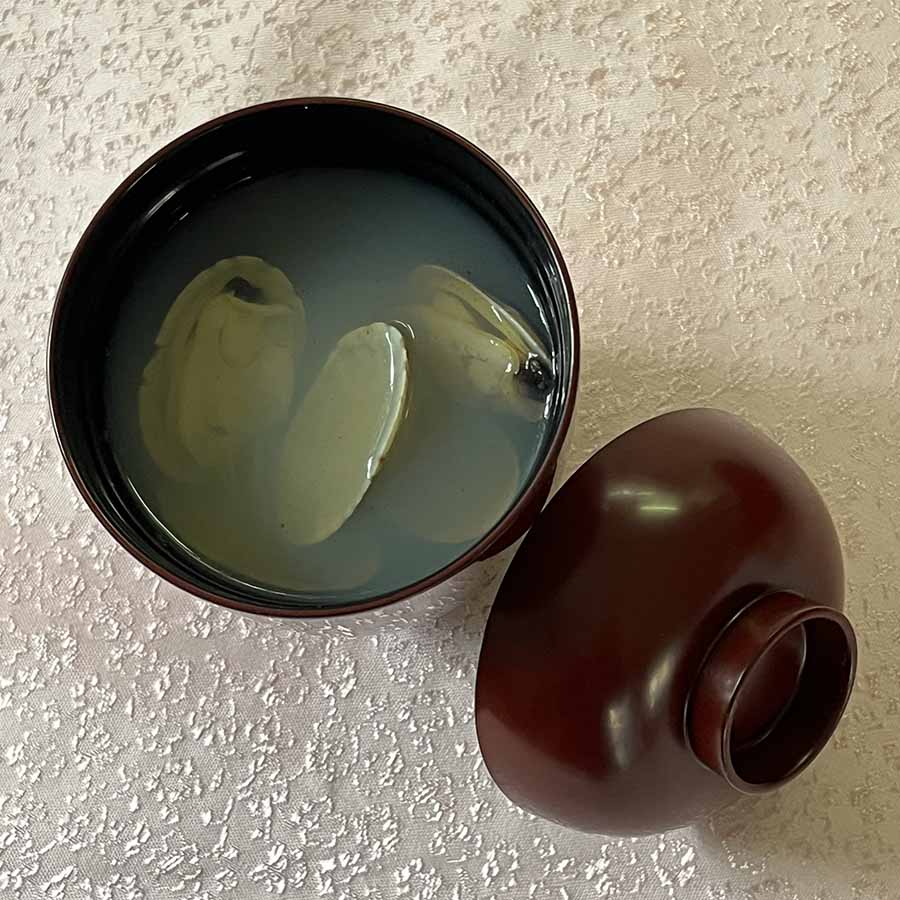 合わせるお汁は、旬のアサリ。貝のうまみが汁に染み出てご飯に合います。汁椀は小ぶりのすっとした形の小吸い物椀です。たっぷり入る平たい椀も好きですが、この食卓では一真窯のモダンな雰囲気の器に合わせてみました。
