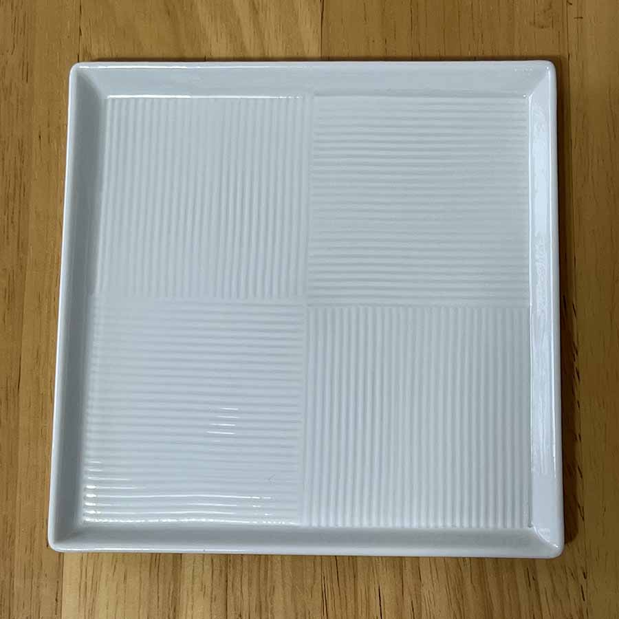 白磁市松彫13.5センチスクエアプレート 一真窯(波佐見焼) 白磁斜面取カップ 一真窯(波佐見焼) 京朱塗9寸大鉢 象彦(京都) 越前塗小吸物椀 不詳(福井県) |